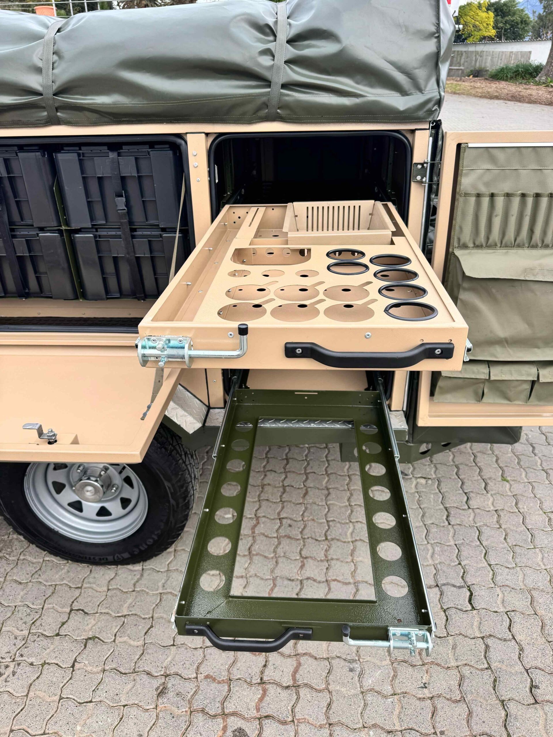 | Kitchen | Slide-out kitchen with worktop, storage, and space for a fridge (60–80L) |
